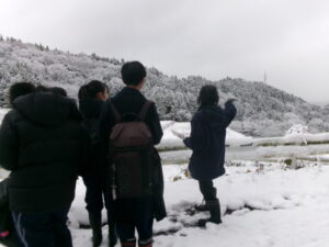 12月4日(水)、食品加工班の2・3年生(2年生2名、3年生2名)は、農業に携わる方々の姿や思いに触れ、食を大切に扱う意識を高めることを目的に、有畜複合循環型農業を実践している有限会社「土遊野」を訪ね、農場を見学させていただきました。最初に案内していただいたのは、壮大な段々に広がる棚田です。