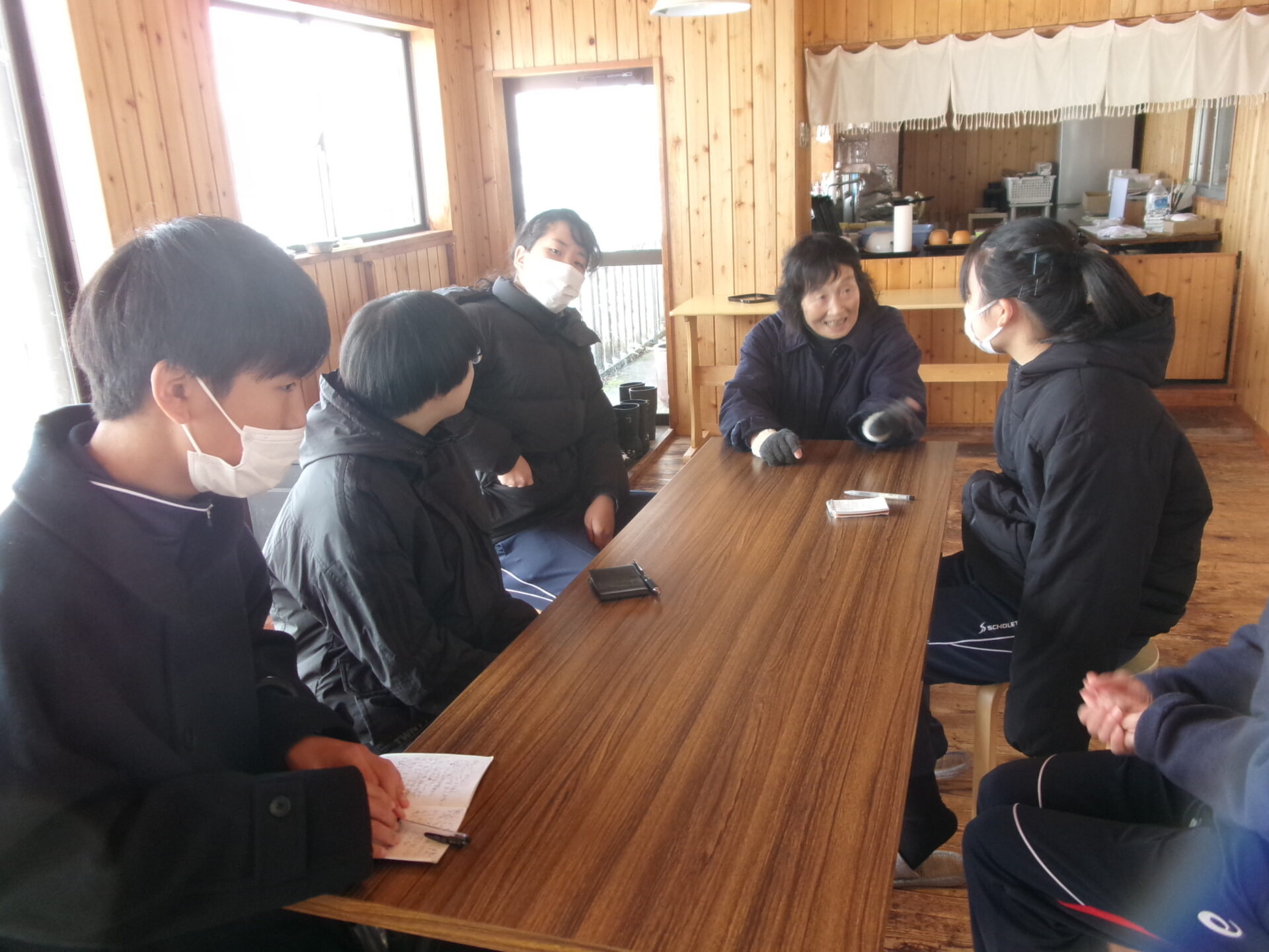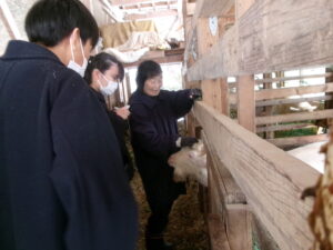 その後、山羊舎にも案内していただきました。おとなしい山羊たちとのふれあいに、生徒たちは緊張しながらも自然と笑顔がこぼれていました。