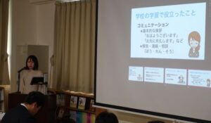 今回は、「幼保連携型認定こども園アームストロング青葉幼稚園」と「富山ヤクルト販売株式会社」に勤務している令和6年度卒業生2名に来校していただき、入社までの経緯、仕事の内容や職場で気を付けていること、学校生活で学んだことなどについて、話をしていただきました。