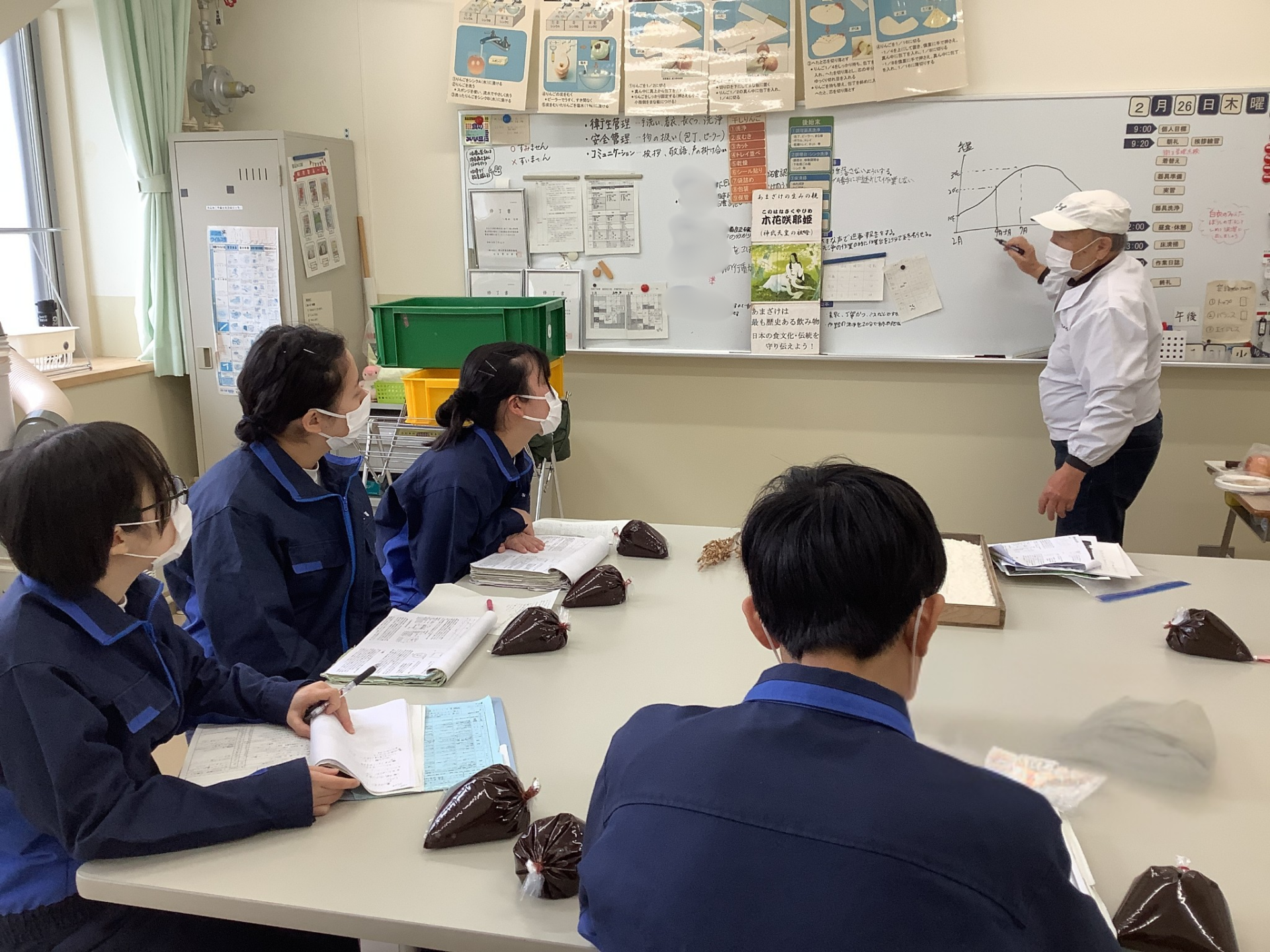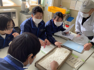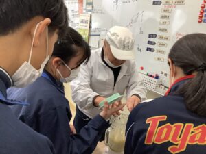 さらに、麹(こうじ)についても詳しく教えていただきました。麹の酵素が発酵を促し、素材の甘みやうま味を引き出すこと、甘酒は砂糖を一切使わず麹の力だけで甘くなることなどを知り、生徒たちは大きな驚きを感じていました。