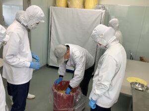 最後に、空気が入ると品質に影響するため、丁寧に空気を抜きながら樽へ詰めました。仕込んだ後は保存する場所や温度が発酵の進み具合に大きく関わることも教えていただき、味噌造りの奥深さを実感しました。今年度は全5回で5樽、完成予定重量150㎏を仕込むことができ、これから10月まで熟成させます。